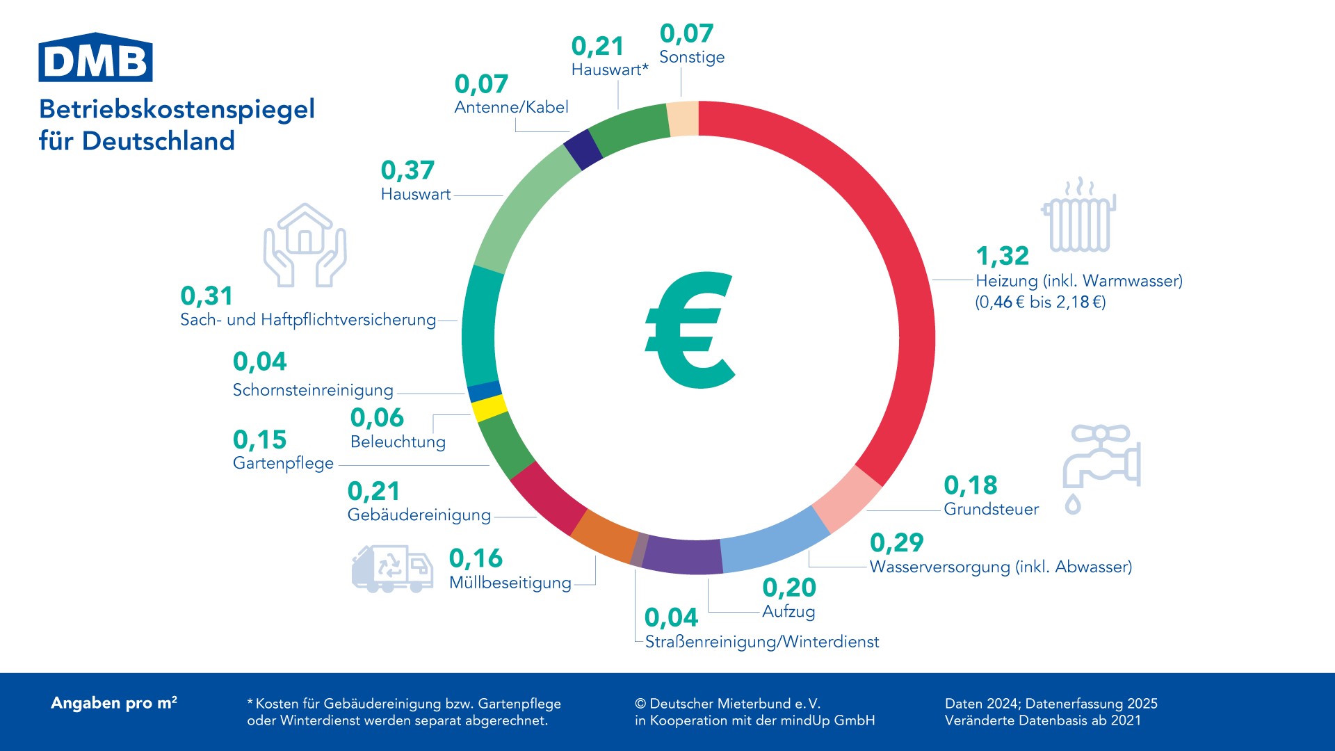 Die Grundsteuer bleibt umlagefähig. Sie lag 2024 im Durchschnitt bei 0,18 Euro pro Quadratmeter und Monat.